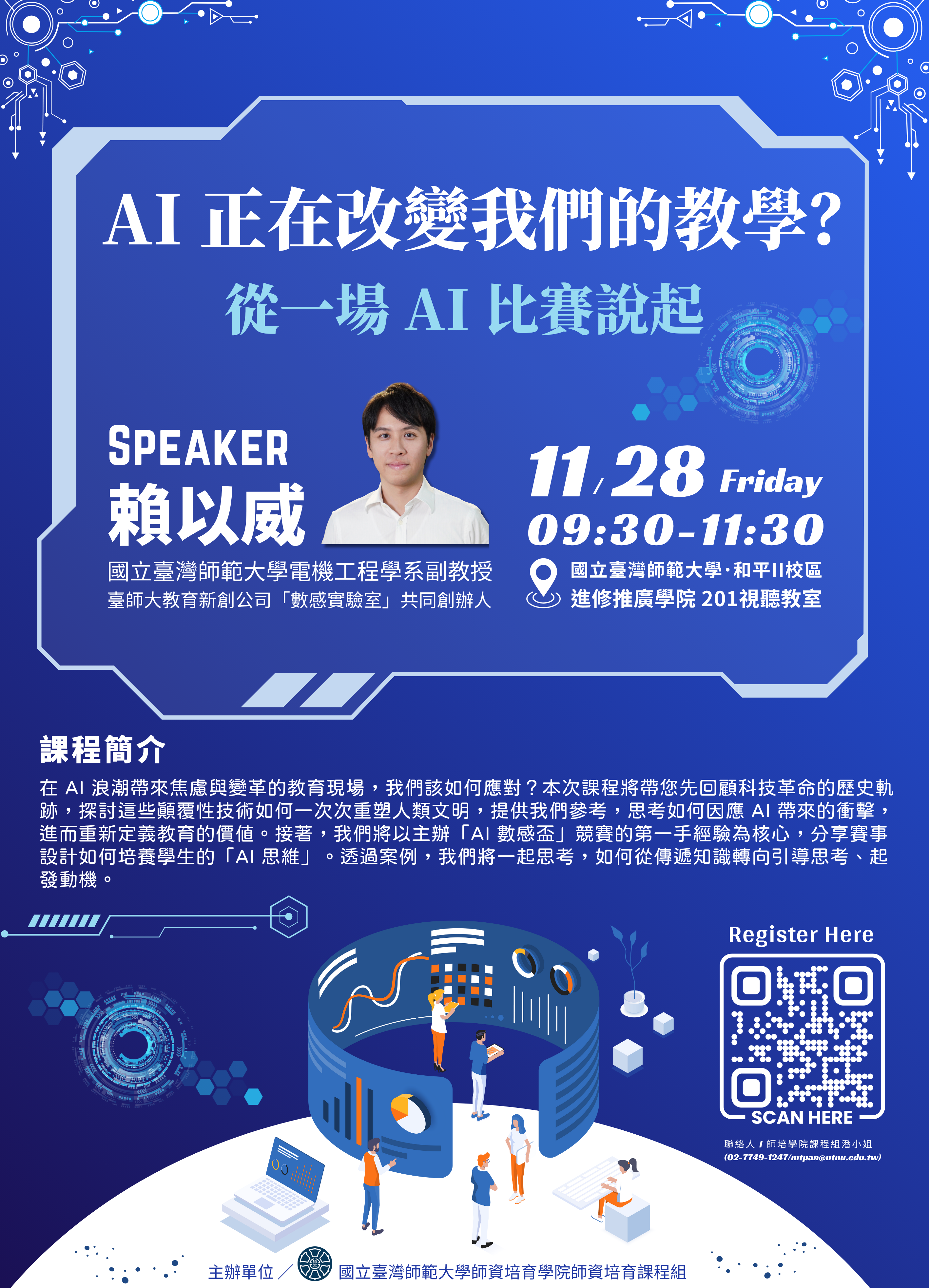 在 AI 浪潮帶來焦慮與變革的教育現場,我們該如何應對?臺師大師資培育學院師資培育課程組將於11 月 28日 (五) 09:30至11:30 辦理「AI 正在改變我們的教學?從一場 AI 比賽說起」實體講座,誠摯邀請您撥冗參與。