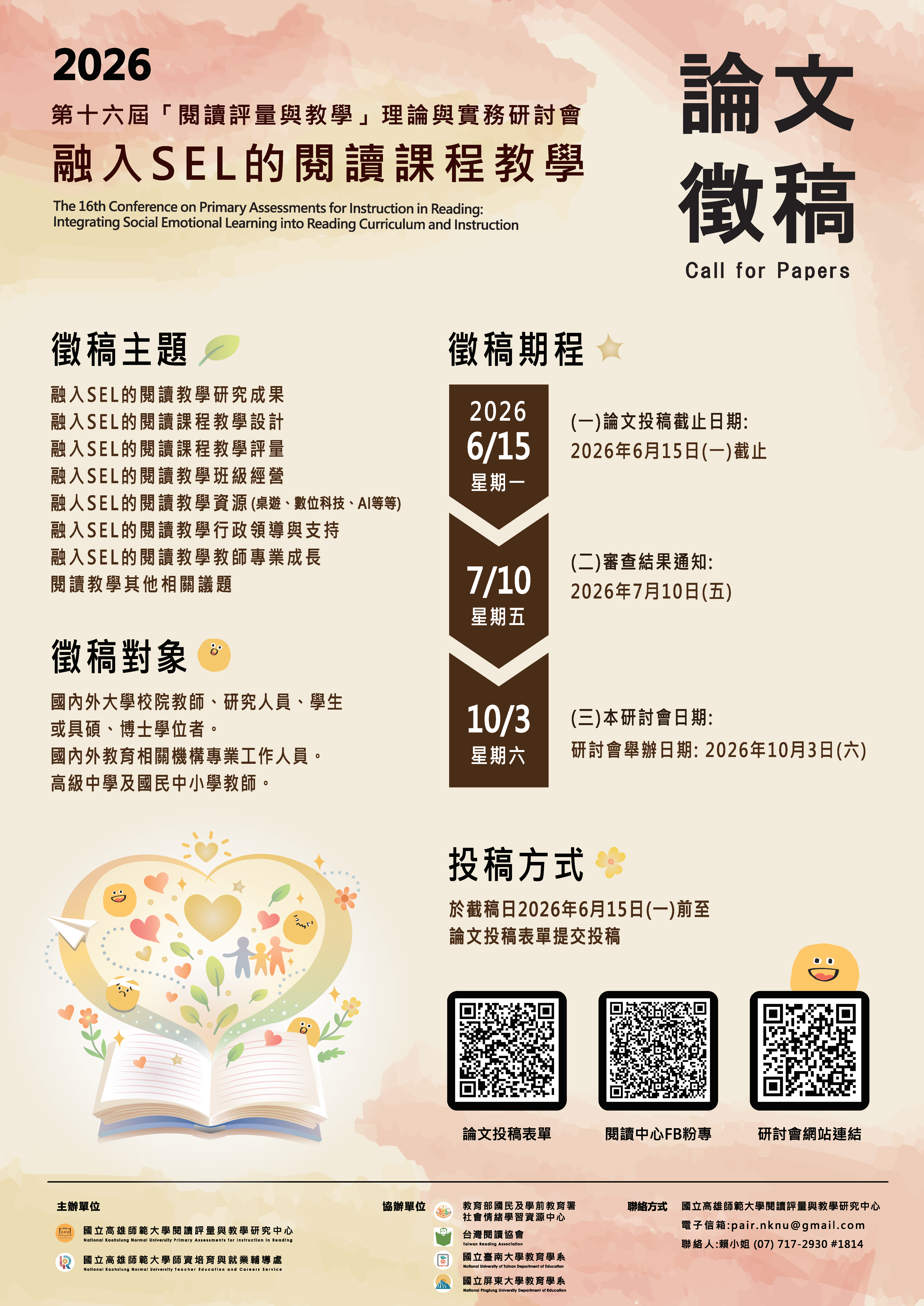 【轉知】國立高雄師範大學-2026年融入SEL的閱讀課程教學論文徵稿